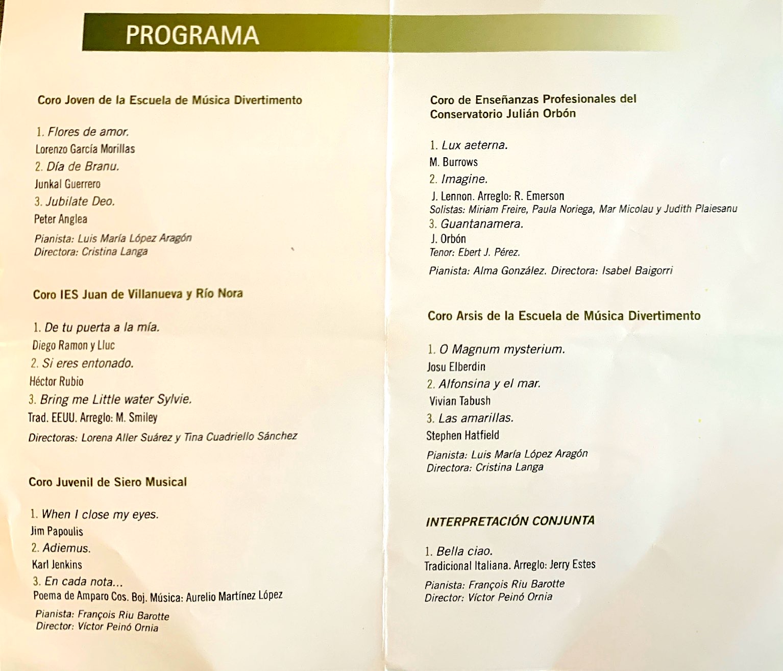 El encuentro, organizado por la Sociedad Siero Musical, reunió sobre el escenario a seis formaciones que ofrecieron un programa variado y de gran calidad. Participaron los coros de los IES Río Nora y Juan de Villanueva de Pola de Siero, dirigidos por Tina Cuadriello y Lorena Aller; el Coro Juvenil de la Escuela de Música Divertimento y el Coro Arsis, ambos bajo la dirección de Cristina Langa; el Coro Juvenil de Siero Musical, dirigido por Víctor Peino; y el Coro de Enseñanzas Profesionales del Conservatorio Julián Orbón de Avilés, dirigido por Isabel Baigorri.
