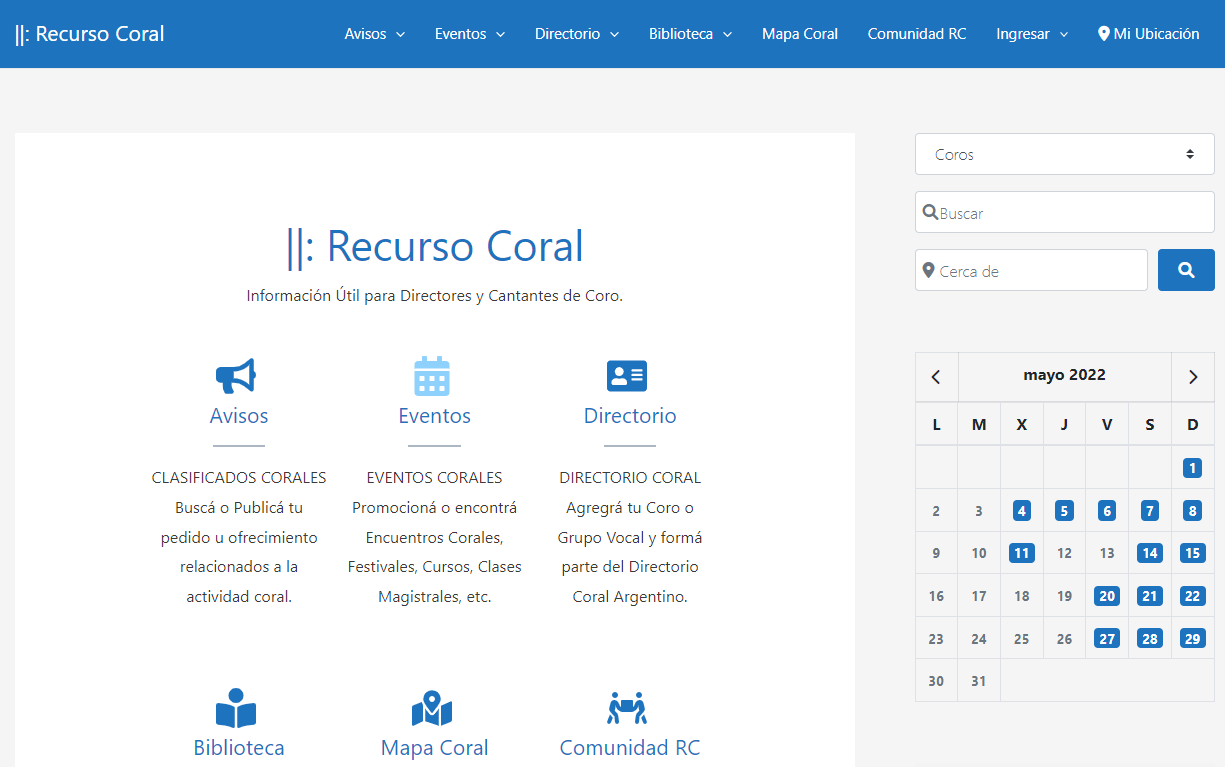 Sitio argentino en el que se puede encontrar información relativa a coros, eventos y recursos musicales relacionados con la música coral.