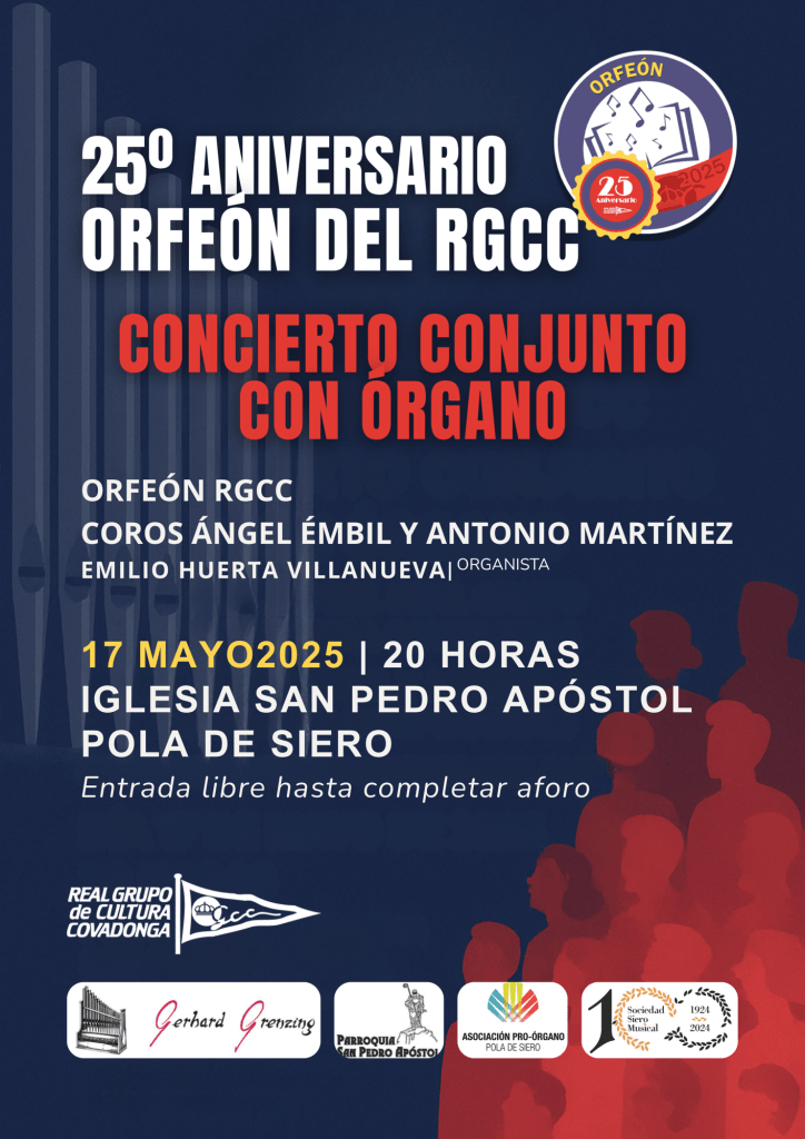 El próximo sábado, día 17, nuestros coros Ángel Émbil y Antonio Martínez ofrecerán un concierto junto al Coro del Real Grupo de Cultura Covadonga en la iglesia de San Pedro de La Pola Siero, a las 20:00 horas. Los coros estarán acompañados por el organista Emilio Huerta.