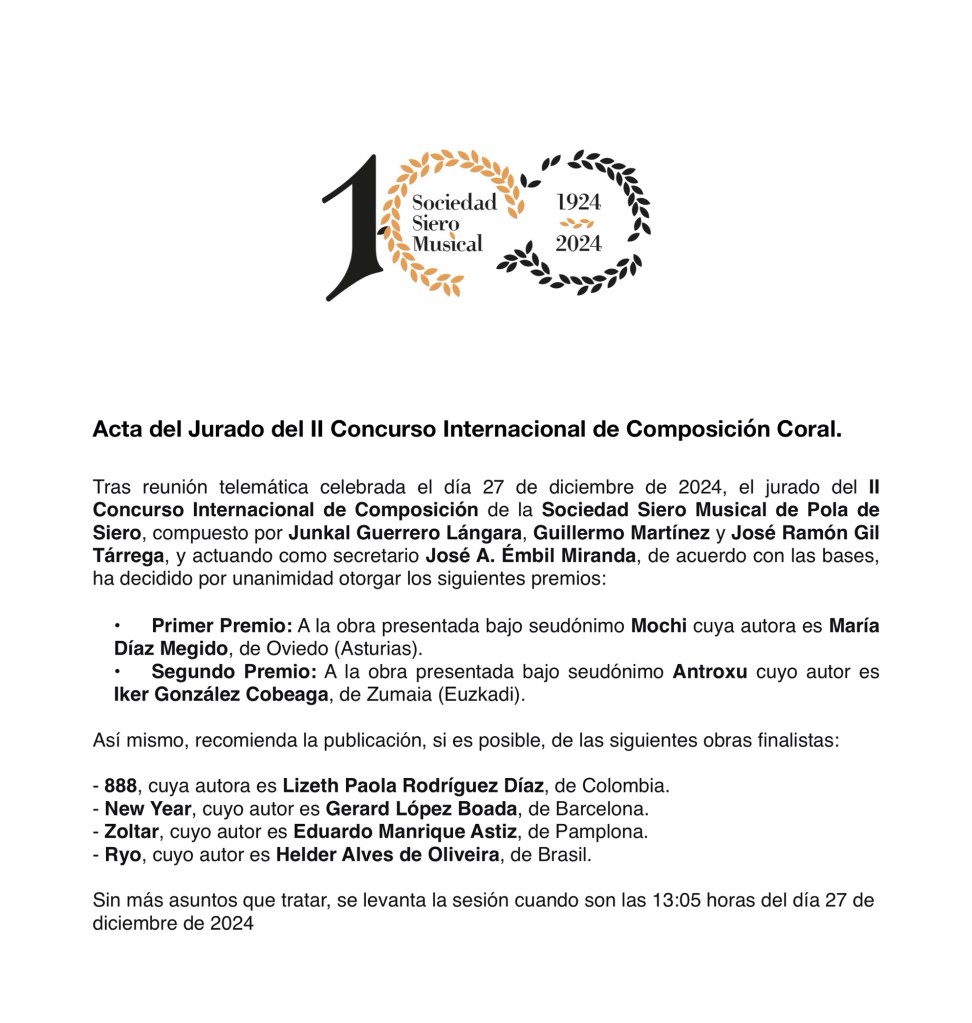 El jurado, compuesto por Junkal Guerrero, Guillermo Martínez y Josep R. Gil-Tárrega ha destacado, además, otras cuatro composiciones, recomendando su publicación junto con las dos premiadas: