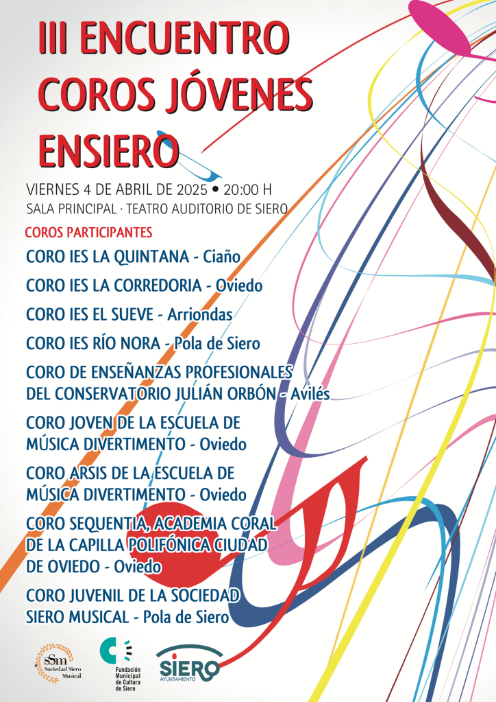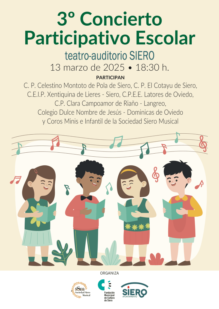 El próximo jueves 13 tendrá lugar el III Concierto Participativo Escolar en el que, además de varios coros de diferentes colegios de Langreo, Siero, y Oviedo, participarán nuestros coros de Minis y Peques.